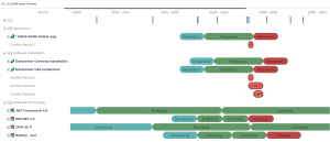 A report enables display in the same Gantt diagram of life cycle steps of the application and its installations.