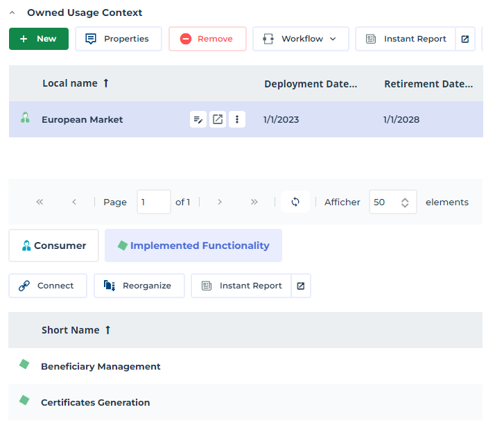 • The list of functionalities associated with the context (Implemented Functionality)