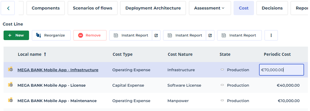 You can create cost lines singly, or automatically create three cost lines corresponding to the three cost natures possible for an application: license, service, manpower.