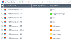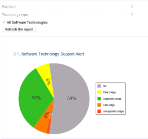 A Support Alert MetaAtribute available on each technology compares the technology life cycle (imported from BDNA or IT-Pedia or defined manually) with its life cycle in the organization.
