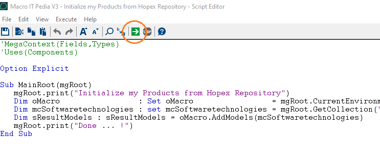 2. Launch the initialization macro ~kKAycUFMZzWC[IT Pedia V3 - Initialize my Products from Hopex Repository].