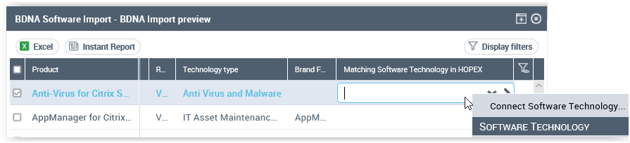 11. (Optional) At this stage you can merge a technology to be imported with a technology of your repository. To do so, click the Matching Software Technology in Hopex column and select the technology of your repository that corresponds to the technology to be imported.