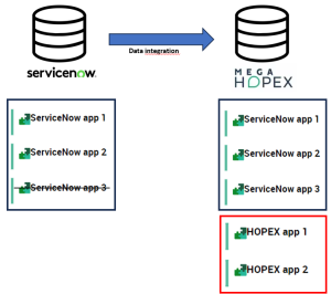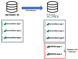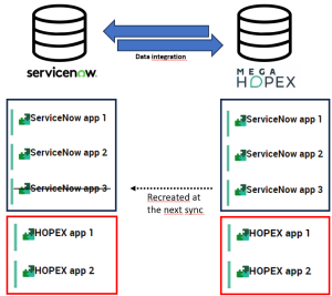 • Any application deleted in ServiceNow is not deleted in HOPEX and vice versa – but it is recreated at the next sync (as data integration is bidirectional).