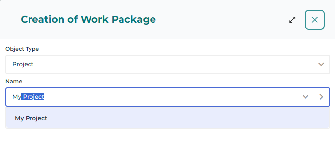 In some cases, the creation wizard will also require additional information that goes beyond the sole ArchiMate® universe purpose. For example, when creating a Work Package, the 'project type' (demand, candidate project, ongoing project) is requested, in accordance to HOPEX Project Portfolio Management requirements.