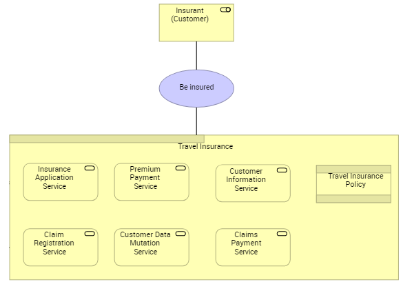 The diagram below shows how Business Services are used to describe the "Travel Insurance" product.