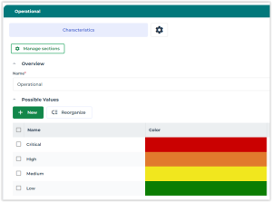 In the properties of an impact type, you can specify the Possible values of the impact type, and for each impact value, the colors to be displayed in the BIA matrix.
