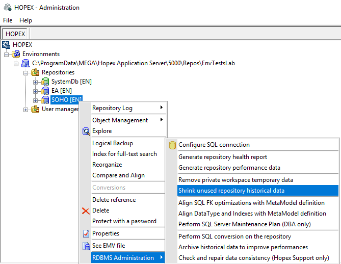 1. Right-click your HOPEX repository and select RDBMS Administration > Shrink unused repository historical data.