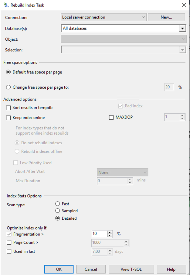 We recommend set up the standard maintenance plans of SQL Server to manage those tasks. The backups can be excluded, if they are done through another chanel.