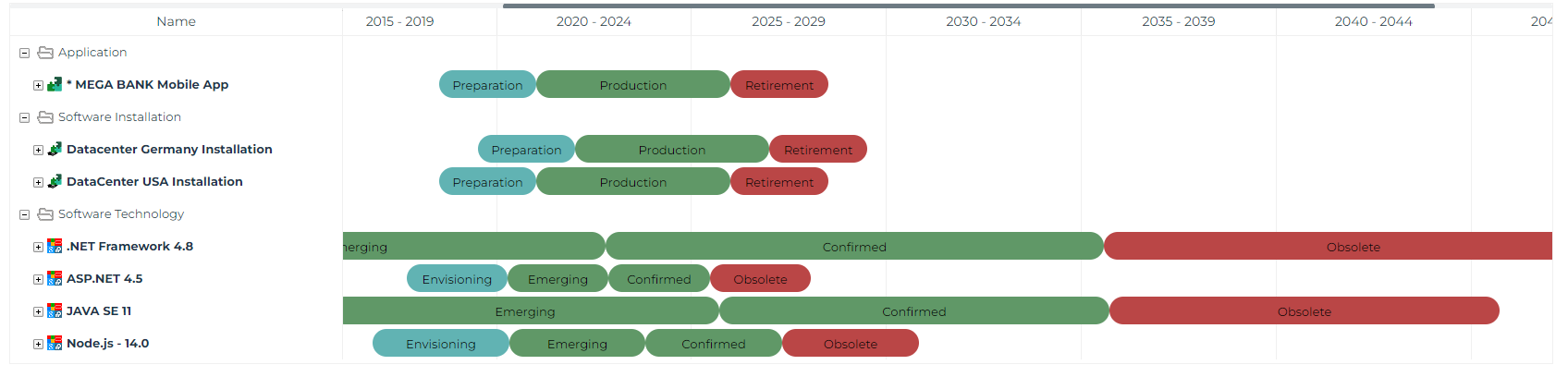 You can view a Gantt diagram in the properties of applications and software technologies: