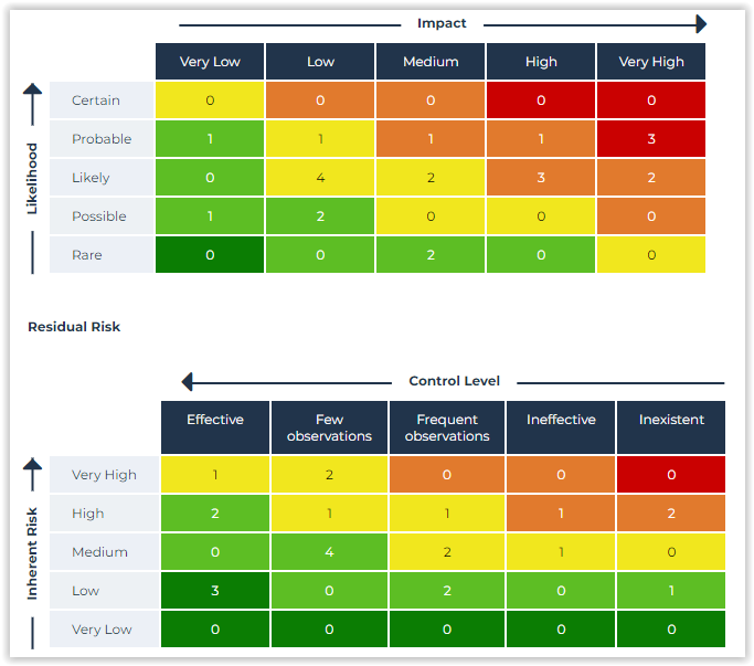 This report enables the Risk Manager as well as all contributors to display the impact and the likelihood of a set of risks. The objective is to view the risks which require attention.