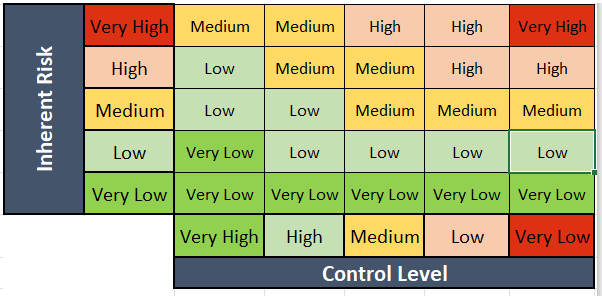 The residual risk is computed based on the inherent risk (Impact * Likelihood) and the control risk level.