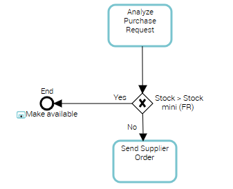 The following example presents a case where continuation of processing is conditioned: following analysis of a purchase request, the process either ends, or an order is sent to a supplier.