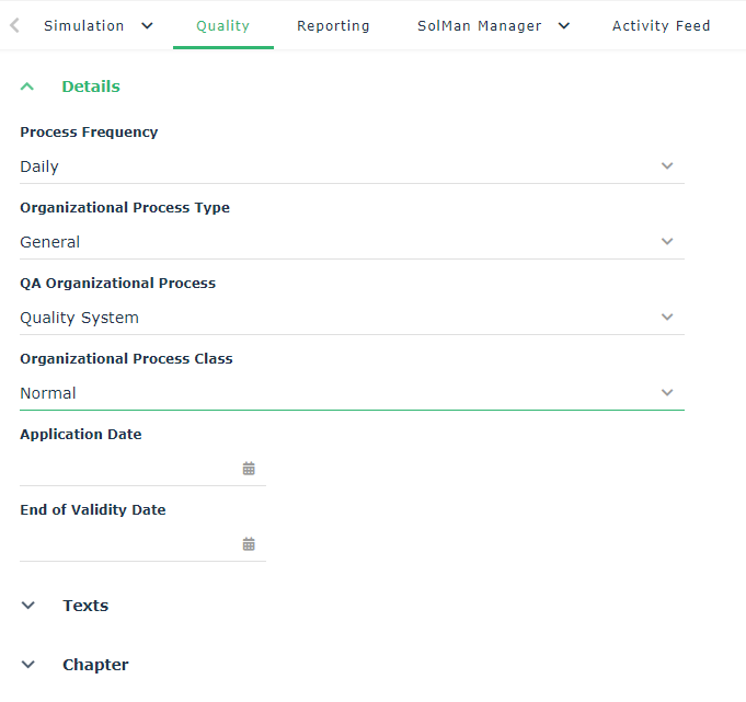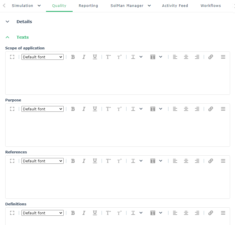 The Quality property page of a process includes a Texts section that allows you to enter different types of text (standard): “Application domain”, “process object”, “references”, “definitions”, etc.
