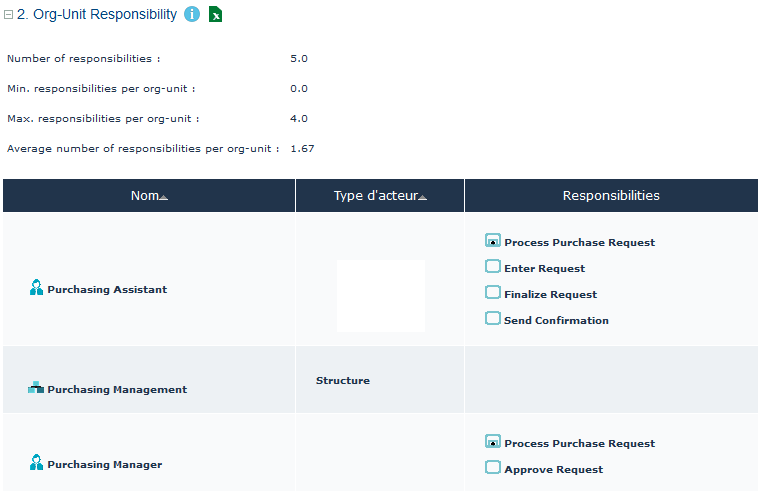 • The second part describes responsibilities of org-units. It presents detail of operations executed by the org-units and the processes for which it is responsible. This part also displays statistical data: maximum, minimum and average value of operations executed per org-unit, as well as equivalent values for assigned processes.