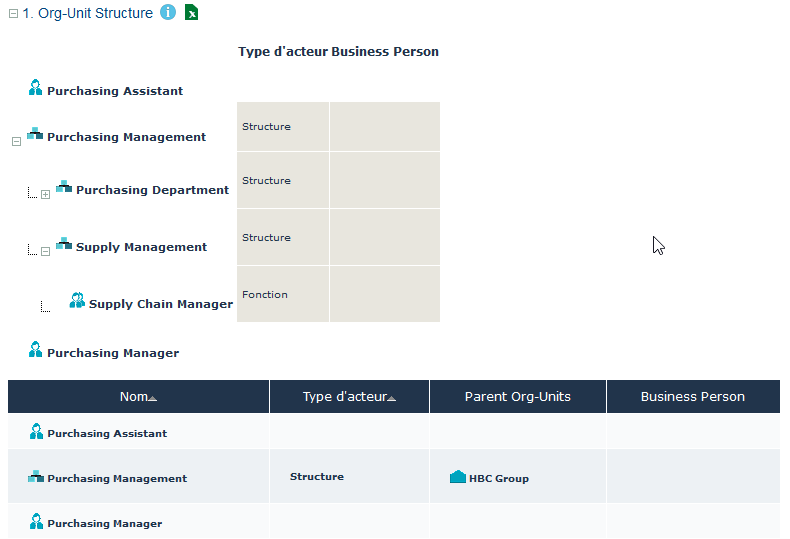 • The first part details organizational structure of each org-unit specified as parameter. In this part, the org-units analyzed are listed with their type, parent, sub-org-units, persons involved in execution of the tasks associated with the org-unit, including other information related to these persons. This part also displays statistical data: number of org-units, number of persons.