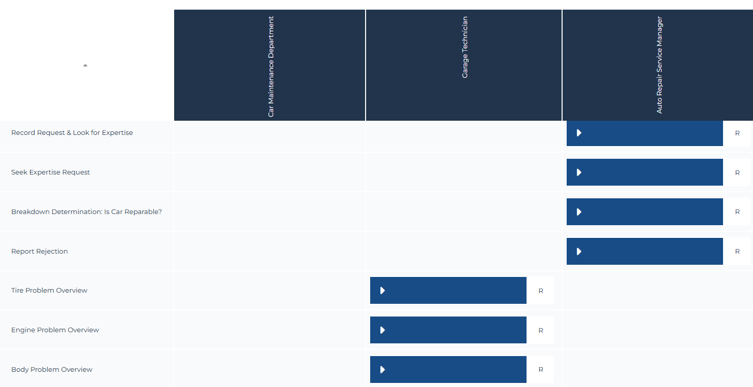 This matrix-style report displays the RACI roles of org-units. Org-units are presented in columns and processes and operations are presented in lines.