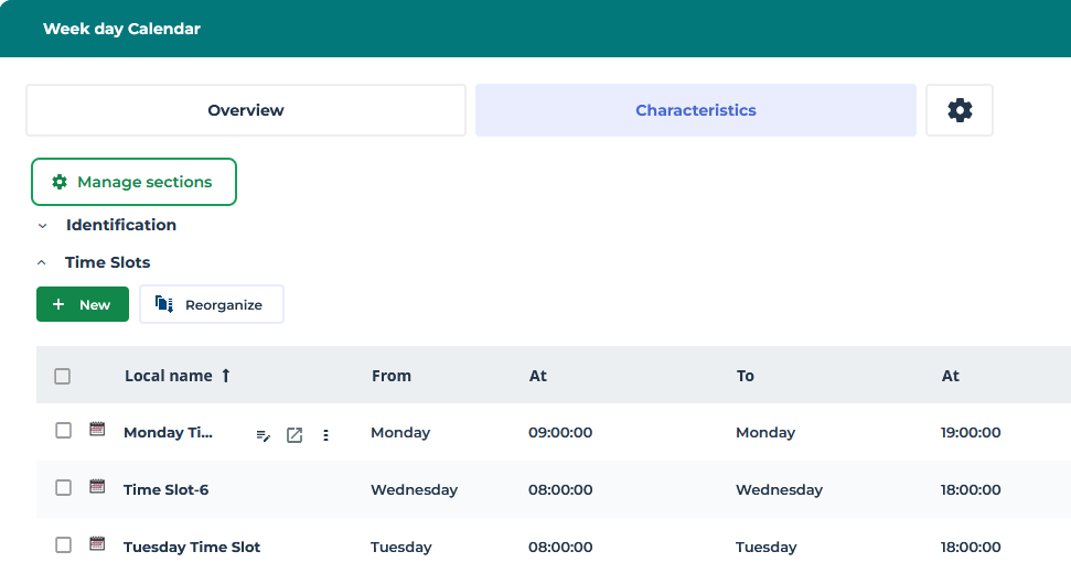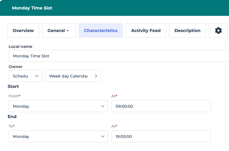A time slot is defined by the day of the week and the time that mark the beginning of the time slot as well as the day of the week and the time that mark its end.