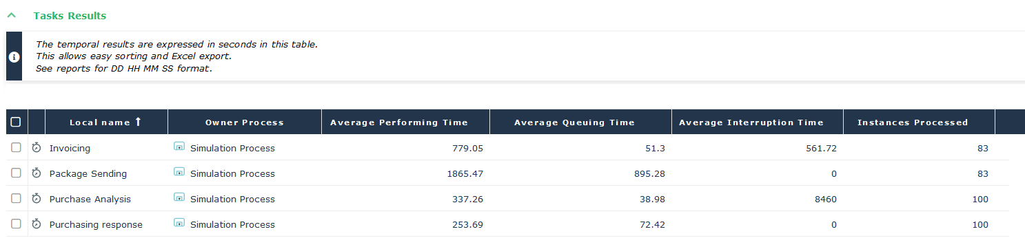 The results for the tasks are given in seconds. They are also available in the form of a report. See