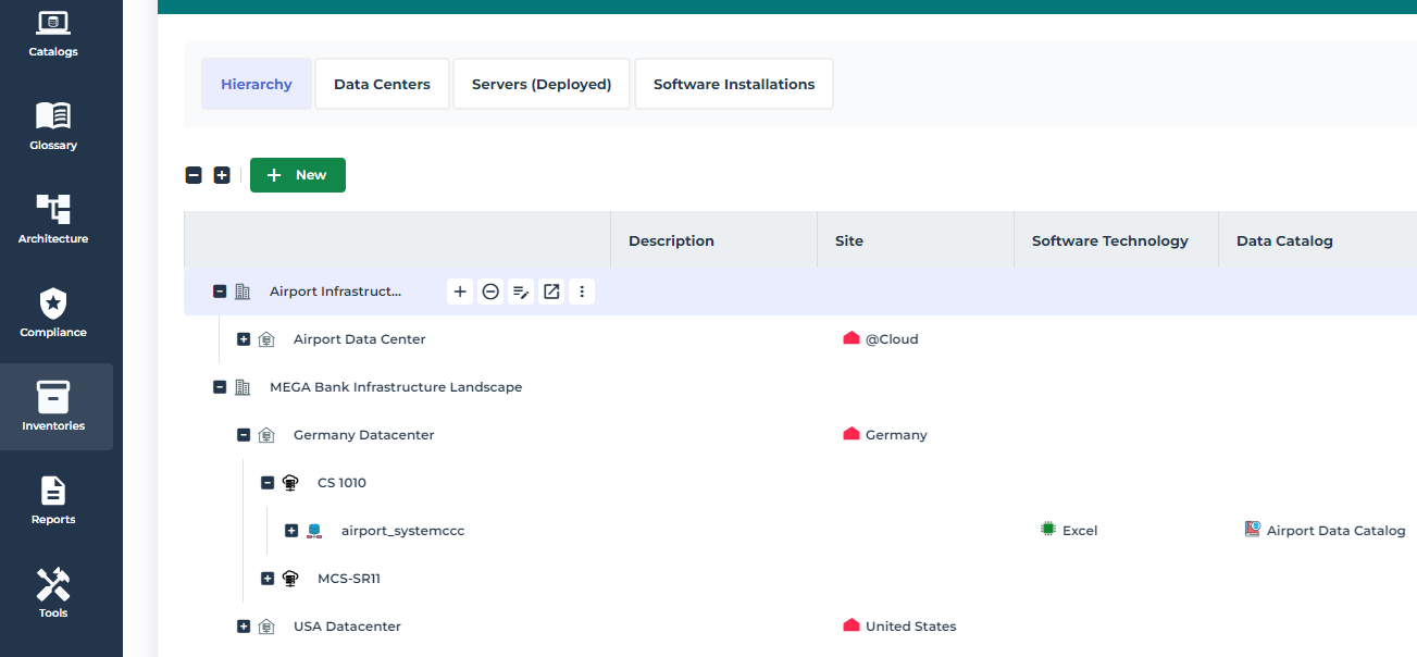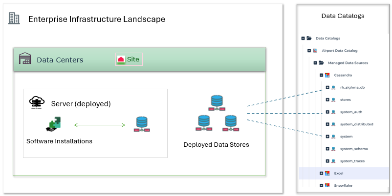 Catalog data sources are deployed data stores, mainly resulting from data discovery using the dedicated HOPEX tool or an intermediate tool such as Manta import.