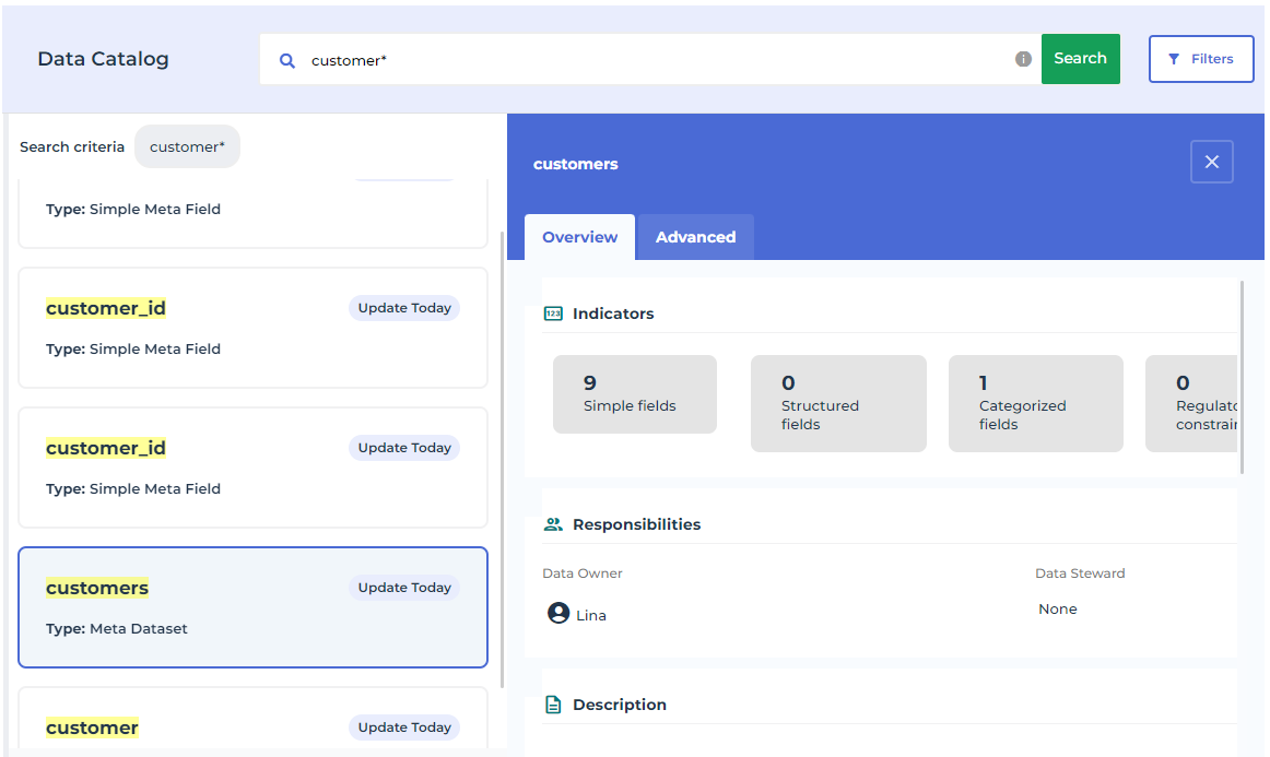 The metadata concerned by the search are meta datasets, simple and structured meta fields, schemas, metadata views and deployed data stores. You can search for all or some of these objects.