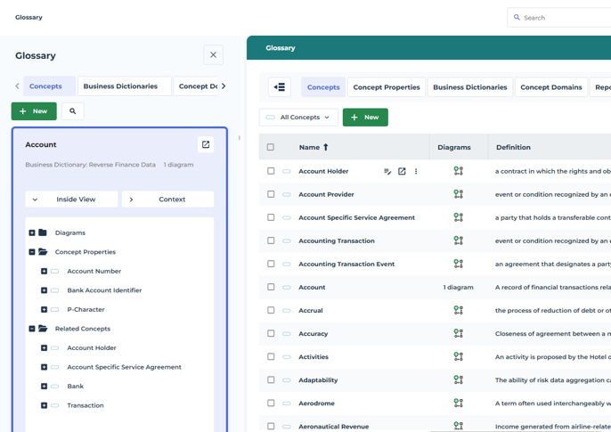 The name of the new concept appears in the tree. It also appears in the tree structure of the holding business dictionary. A new term with the same name as the concept is also created.