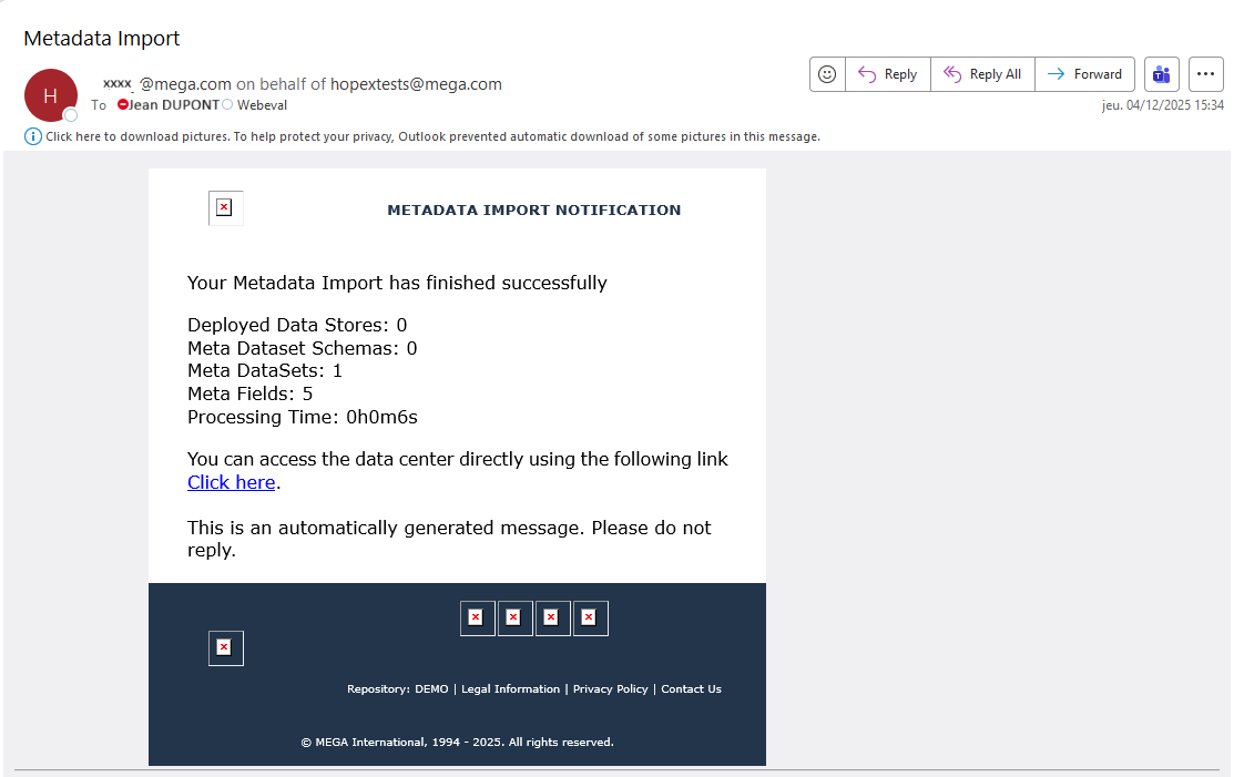 At the end of the treatment, the user responsible for the import is notified of the result via two channels: