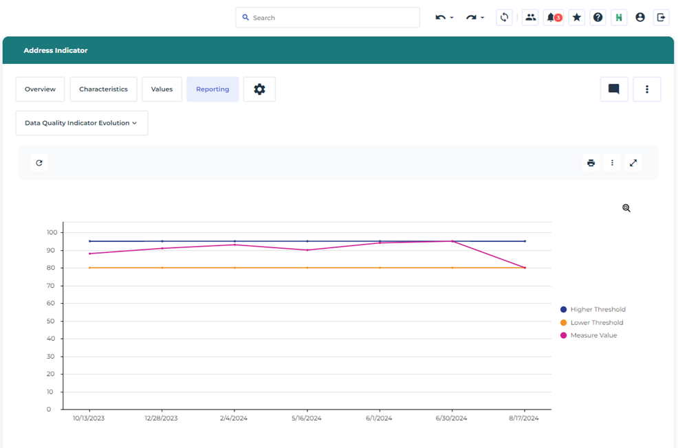 1. In the indicator properties, click Reporting > Data Quality Indicator Evolution.