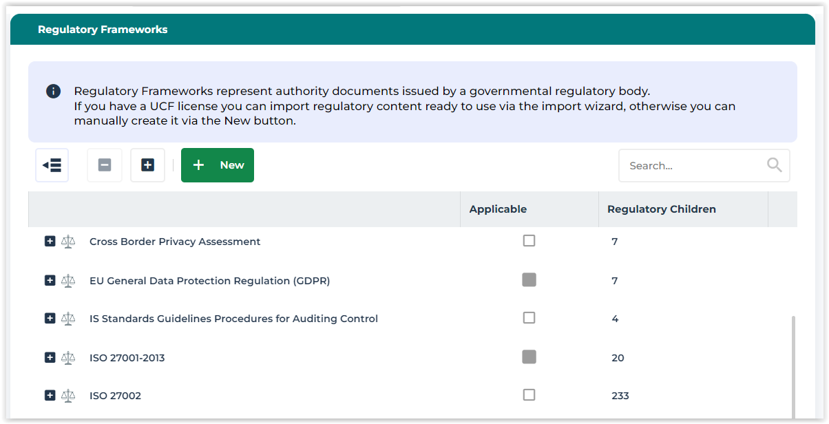 Compliance officers can inspect the imported regulatory frameworks and specify which ones are applicable.
