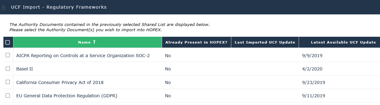 In Hopex Data Governance, the functional administrator can import relevant data from the UCF Common Controls Hub (Authority Documents, Citations and Controls).
