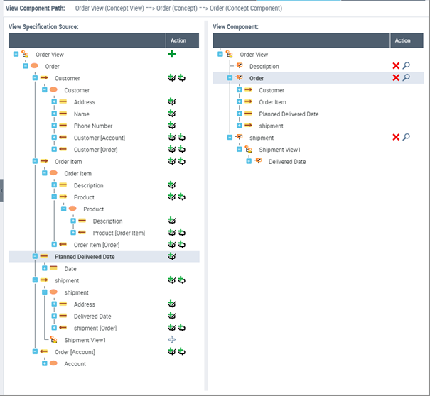 • the left part that presents all the concept components held by the view, as defined in the business dictionary.