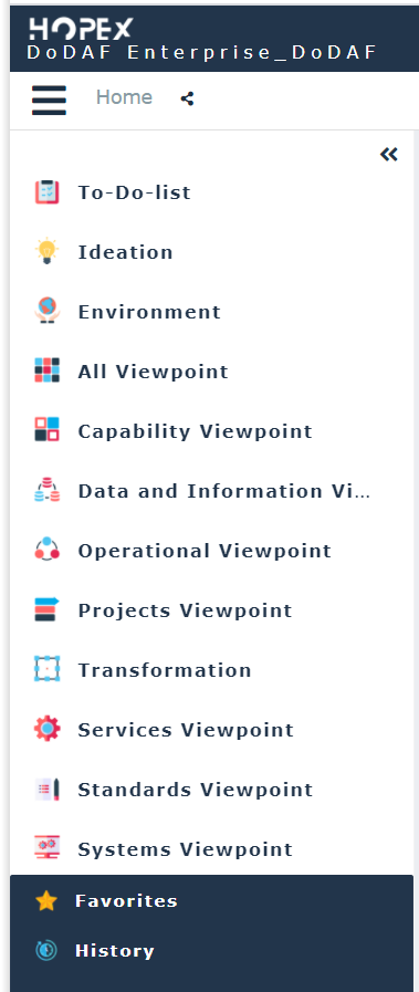The Home page of Hopex DoDAF displays tiles which reference object types of the repository.