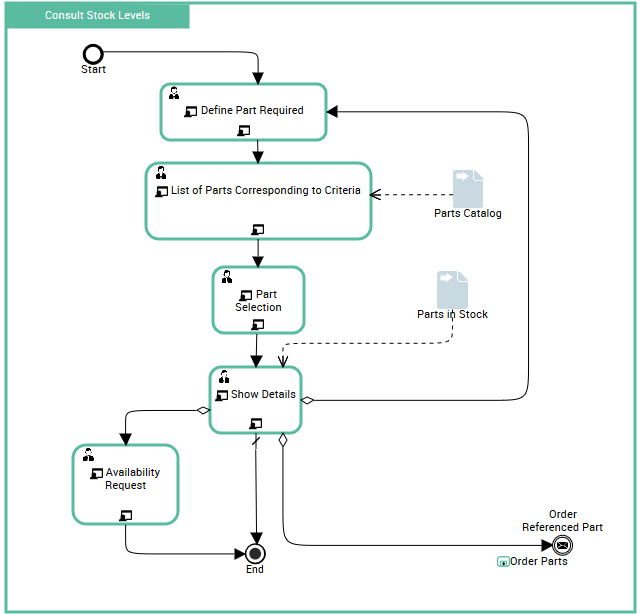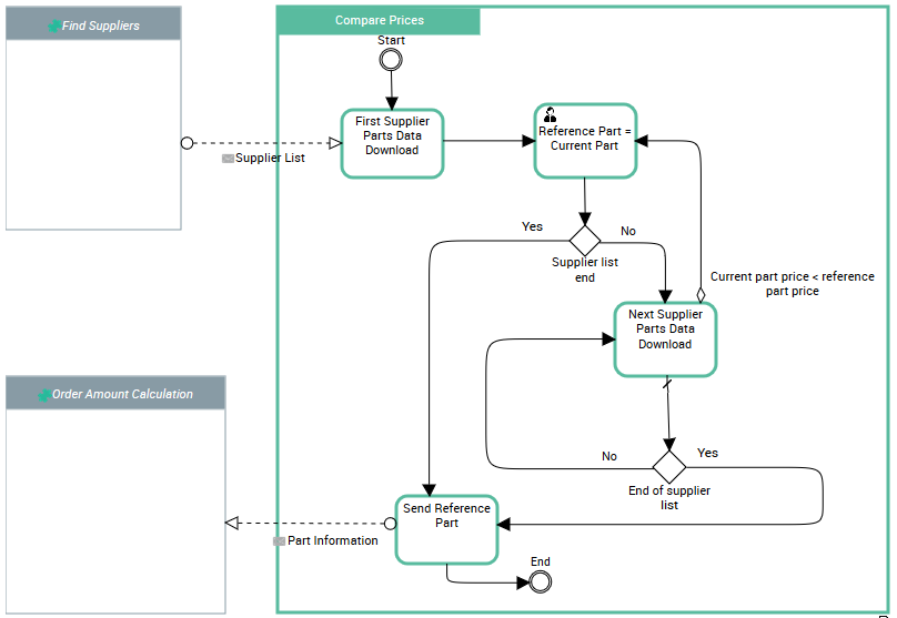 When the complete list of suppliers has been analyzed, information concerning the reference part is sent to the "Order Amount Calculation" service.