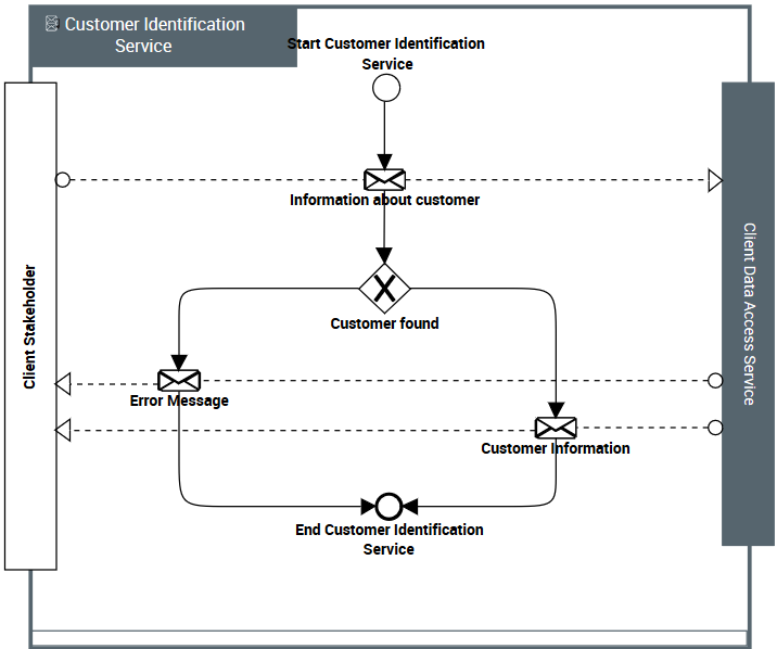 The customer identification service protocol begins by sending information enabling identification of the customer. An error message appears if the customer is not found, otherwise customer information is sent (customer identification, status of orders, etc.).