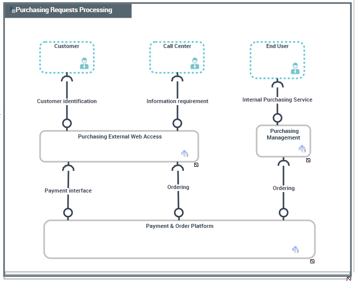 The following diagram describes the structure of the logical application system "Purchase request processing" offered to customers.