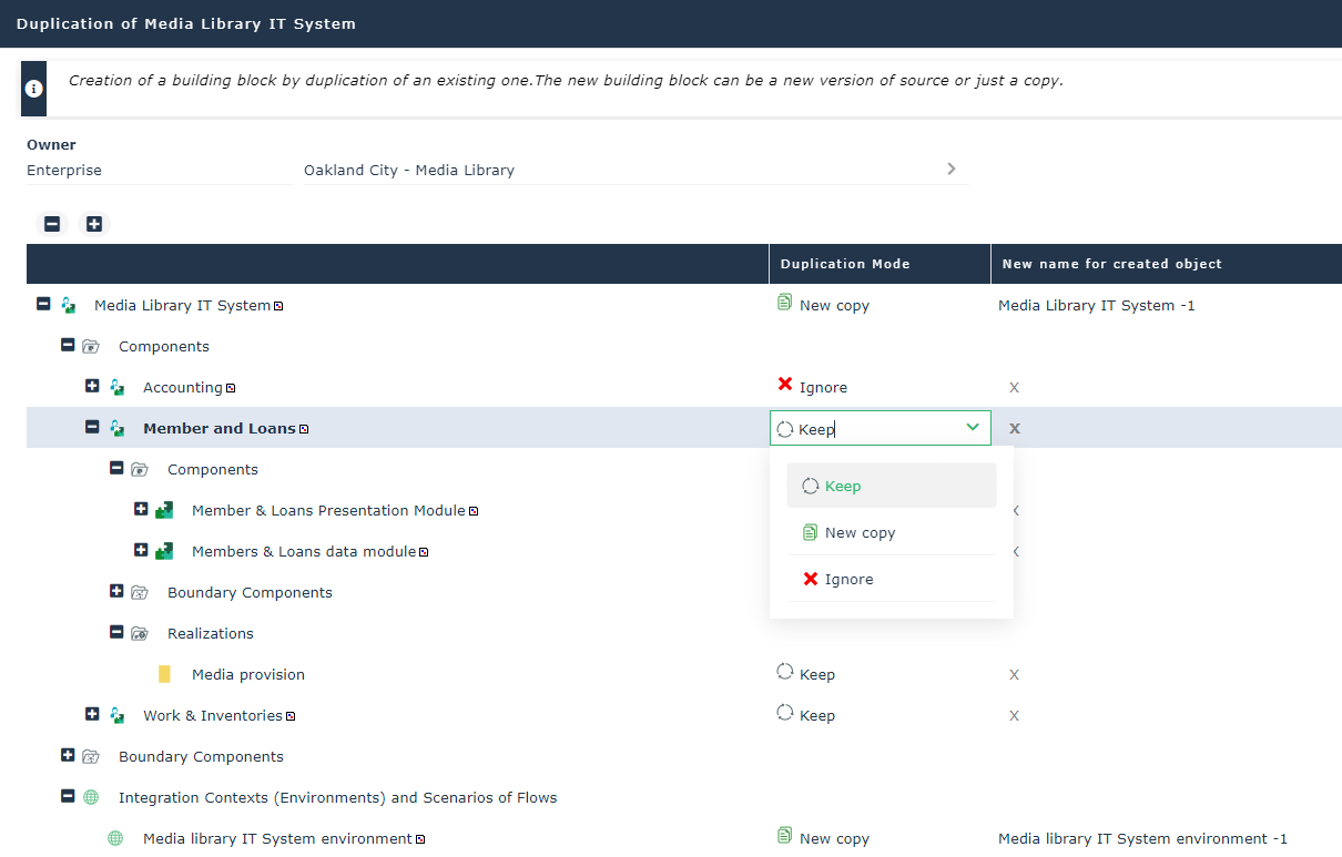 Hopex IT Architecture solution provides facilities for specific building blocks duplication such as applications, application systems or deployment architectures.