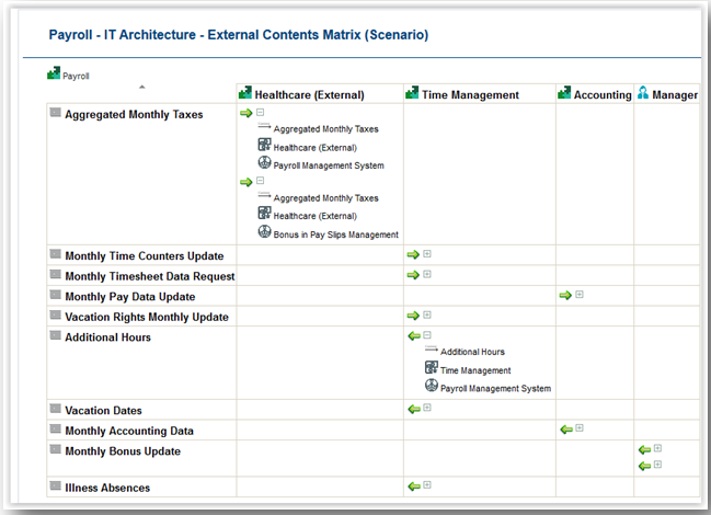 This report displays a matrix of contents sent or received by analyzed agent with other agents, limited to scenario descriptions (Application Flows).