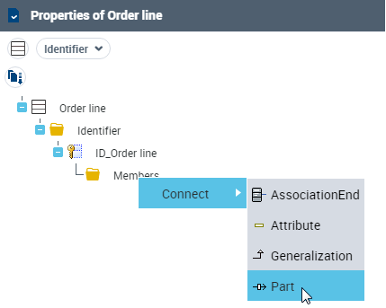In the example below, the identifier of the “Oder line” class can be defined from the “Order” class through the “Order line” part.