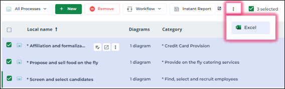 The Excel file shows the exported objects in rows and some of the editable attributes in columns. This file cannot subsequently be imported again into Hopex.