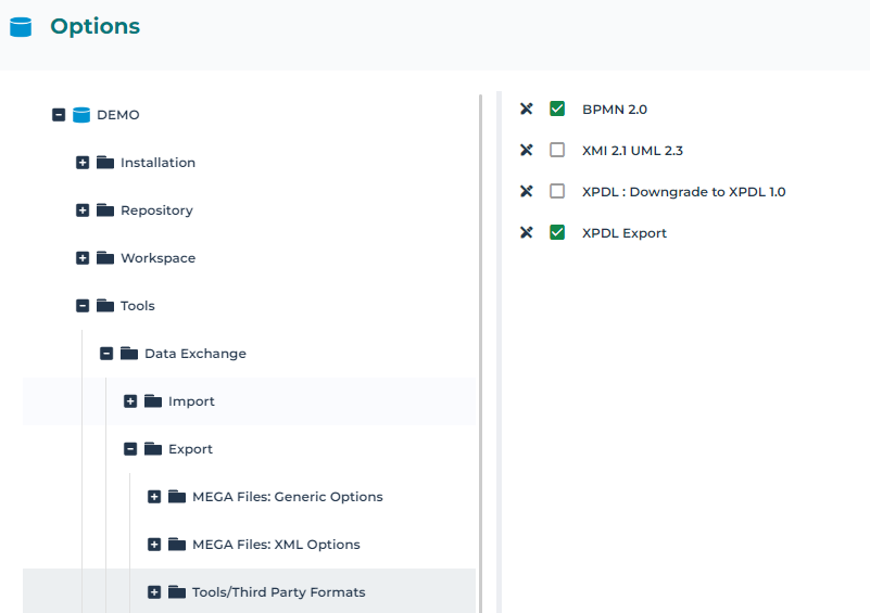 The BPMN export feature can be activated or deactivated for a user, a profile, an environment, or a site. This can be done using the corresponding option: