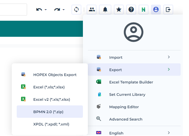 1. In HOPEX, select Main Menu > Export > BPMN 2.0 (*.zip).