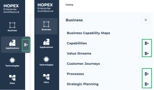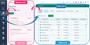 In some Solutions, the cards show buttons when hovering the cursor. These buttons give access to elements related to the object of the card. These elements are presented as a tree or list.