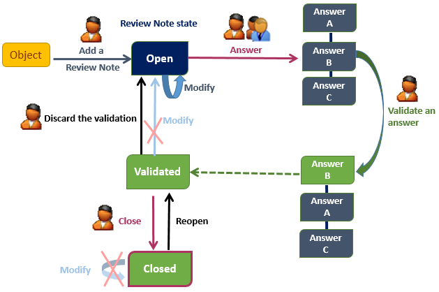 The diagram below presents the actions linked to the states of a review note and the elements that participate in the review note.