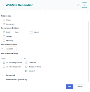 To configure a recurrence from the WebSite Generation wizard: