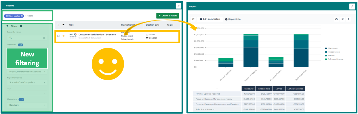 Example 3: the filtering is dynamic and narrows down as you select categories. If you cannot configure the required filtering, it means that the report does not exist. You can then create the report.