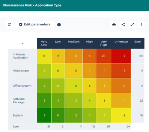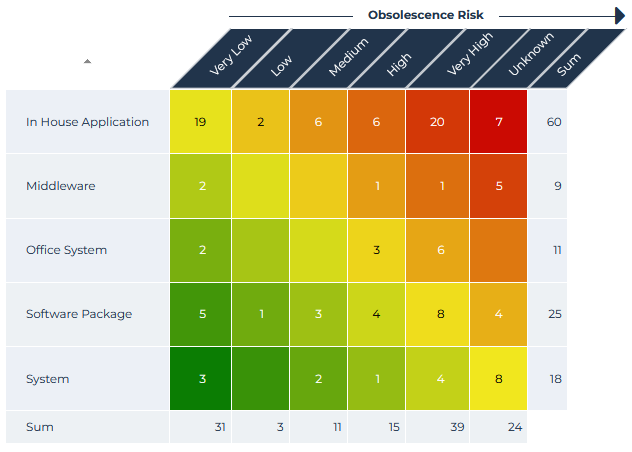 The following heatmap shows the risk of obsolescence (Very Low, Low, etc.) of a list of applications according to their type (Office System, System, etc.).