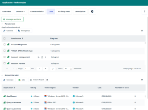 For example, a Report DataSet with “Applications - Technologies” as a definition contains the following data for each application selected (objects to extract):