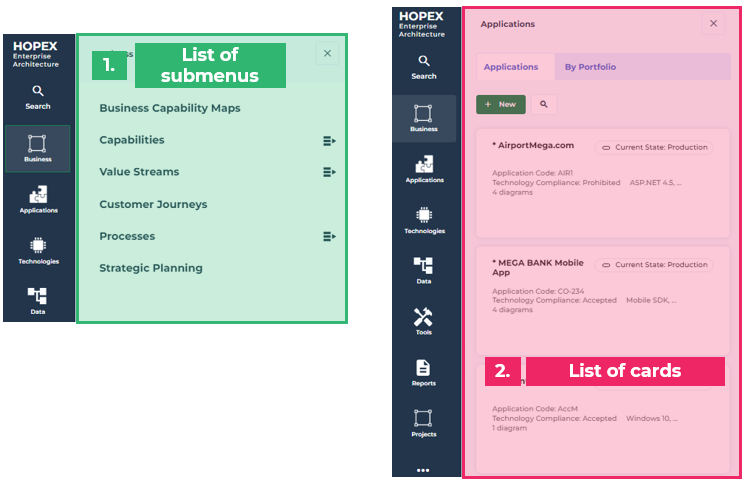 Example 1: submenus displayed from the Business navigation menu with the Enterprise Architect profile.