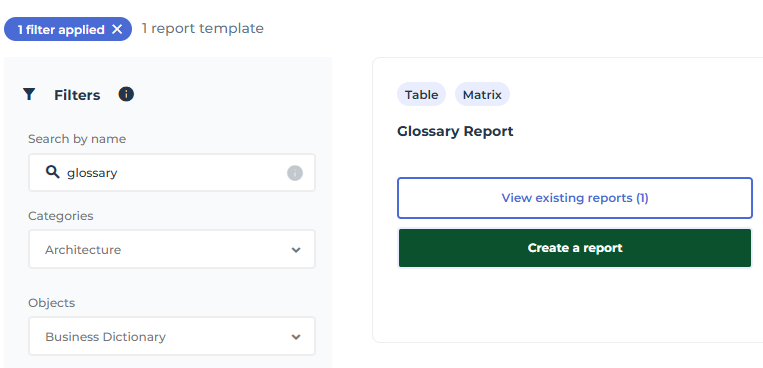 4. Move the mouse over the "Glossary report" template and click Create a report.