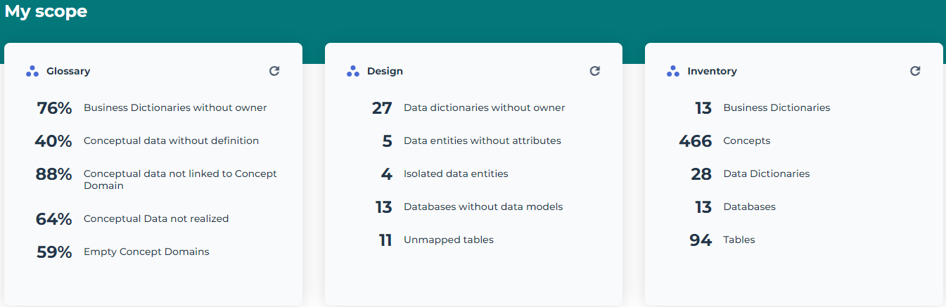 The My Scope section provides useful indicators on application assets. Clicking the indicator takes you to all the corresponding objects. There are three groups of indicators: