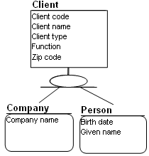 In the above example, attributes are interesting on persons that are of no avail for other categories of clients. Person is a dependent entity represented by a rounded corner box.